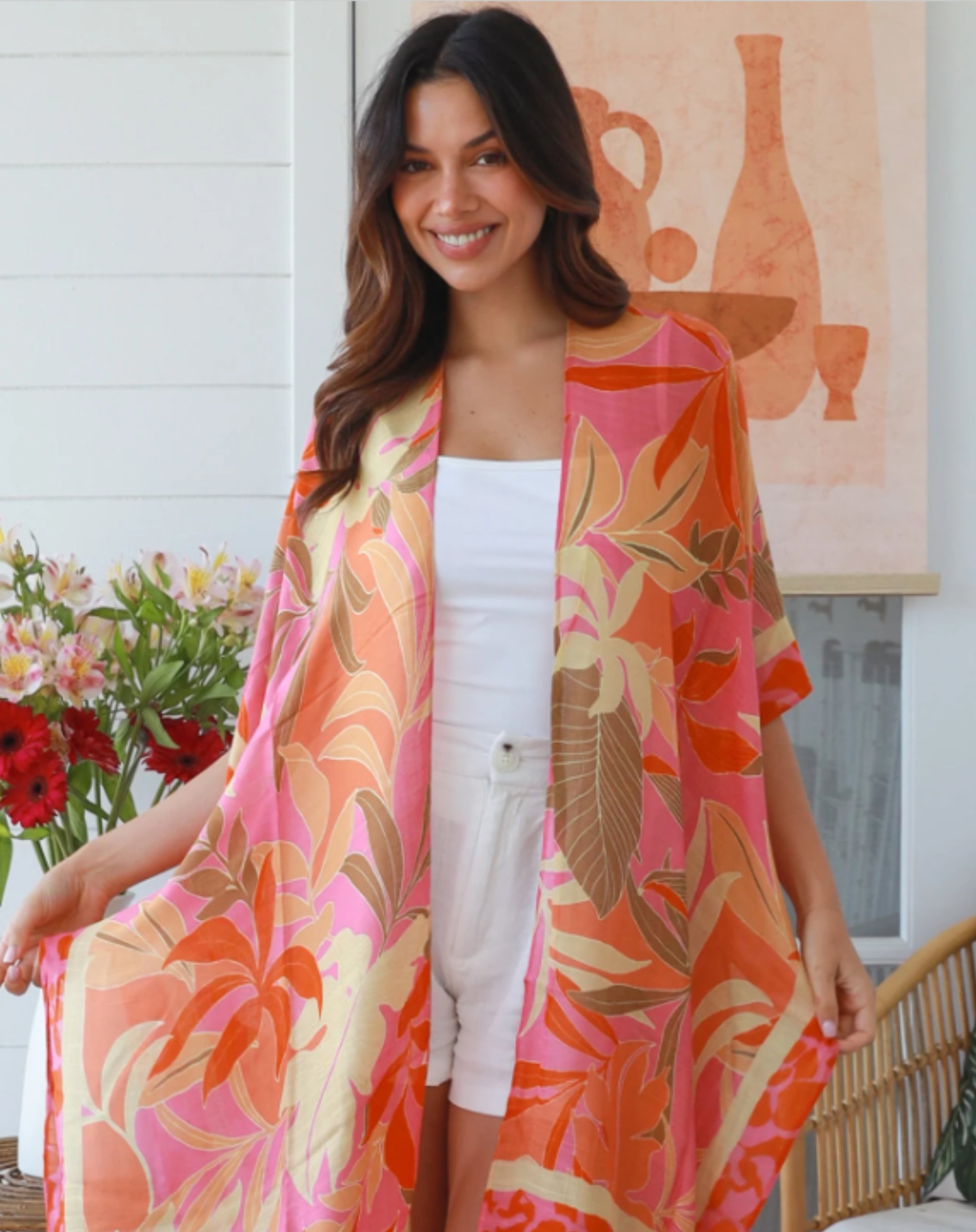 The Sunset Floral Kimono Jacket adds a sun kissed and feminine look to any outfit. It offers a beautiful drape without any cling and pairs well with dresses, shorts and a tee, or resort style pants. It’s our most loved lightweight layer that makes dressing from day to night effortless making it perfect companion for weekend, travel and cruising adventures.