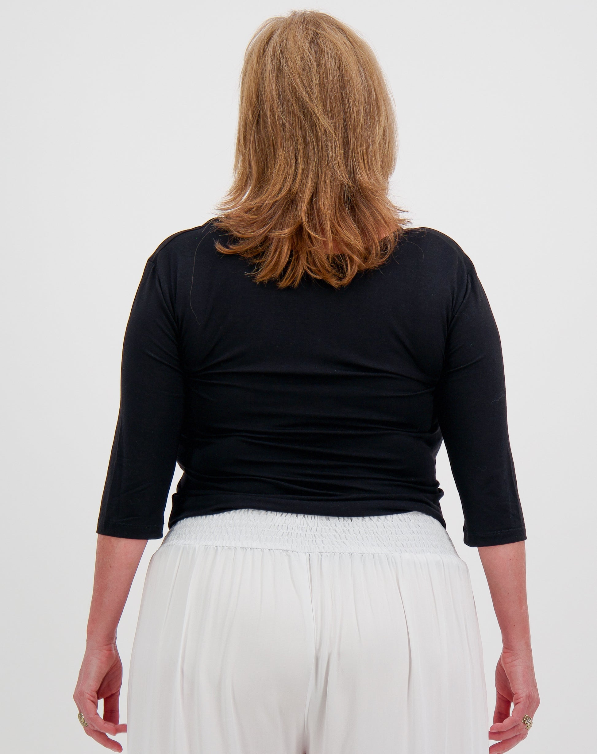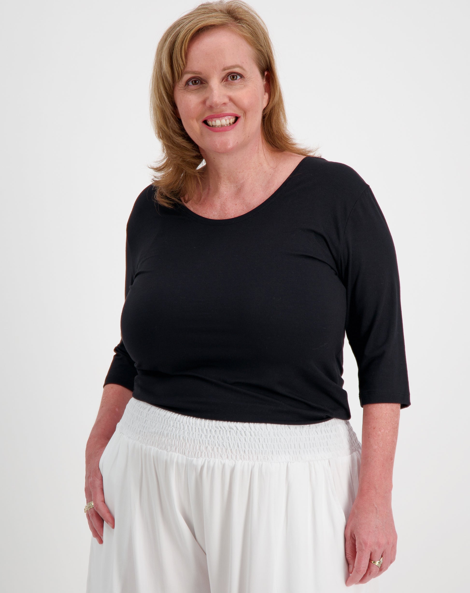 The Black Modal Scoop Tee is a slightly fitted wardrobe essential, perfect for layering or wearing on its own. Crafted from ultra-soft, breathable modal fabric, it offers a comfortable, smooth fit with a flattering scoop neckline. The lightweight design and timeless black shade make it incredibly versatile, whether you're dressing up or keeping it casual. This tee combines softness, stretch, and style to create a sophisticated yet easy-to-wear piece for everyday comfort.