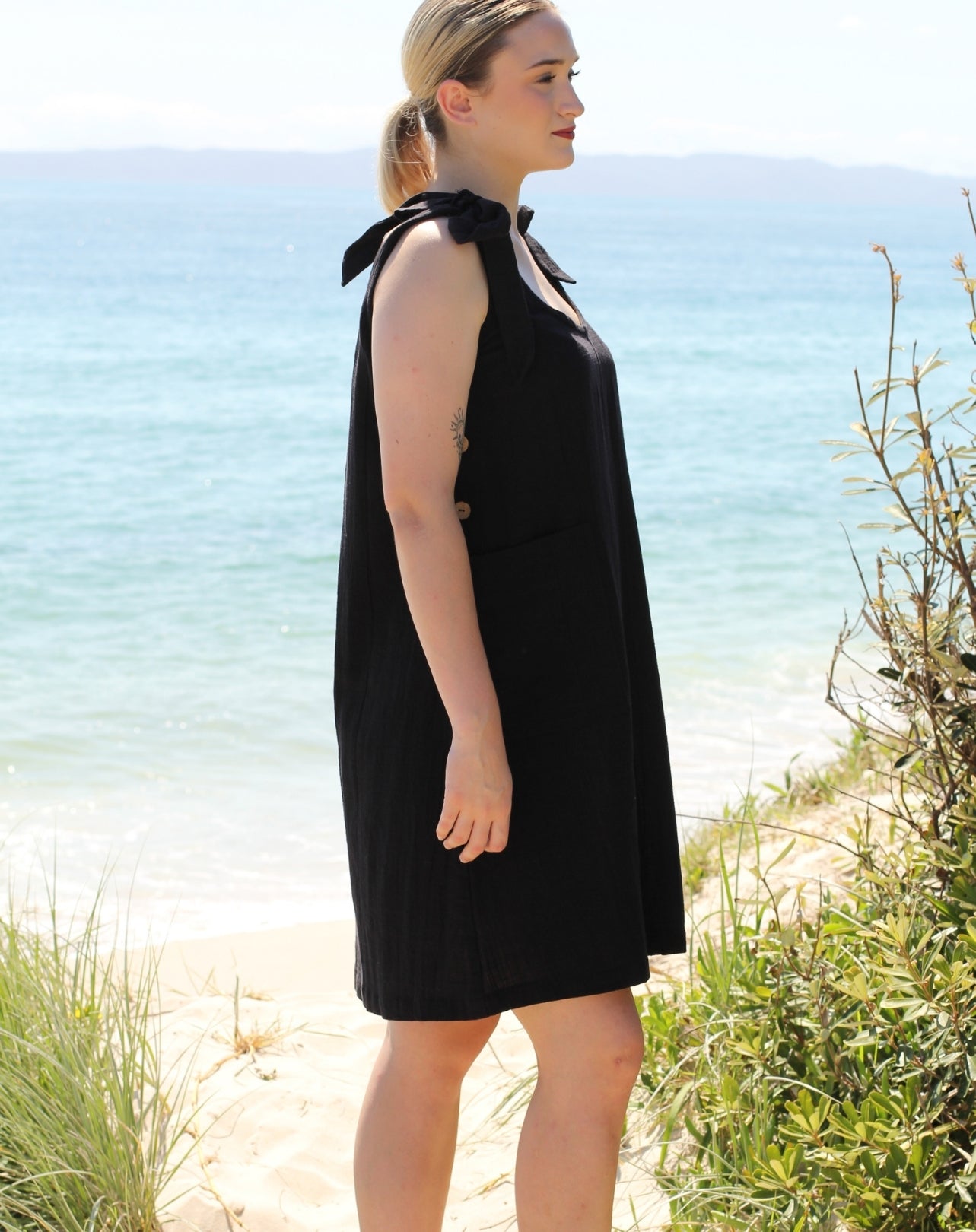 Meet your new wardrobe hero introducing the Tie-Strap Smock Dress in Black Cotton. Crafted from soft breathable cotton, this dress features adjustable tie straps for a customizable fit and a loose, flattering A-line silhouette that skims over curves gently. Bra-friendly and versatile, it can be worn with a tee in cooler months and without a tee in summer, making it a all season go-to piece for women of all ages. Styled with our scoop tee in white. Ironing is optional with it's natural soft fibre crinkle finish.
